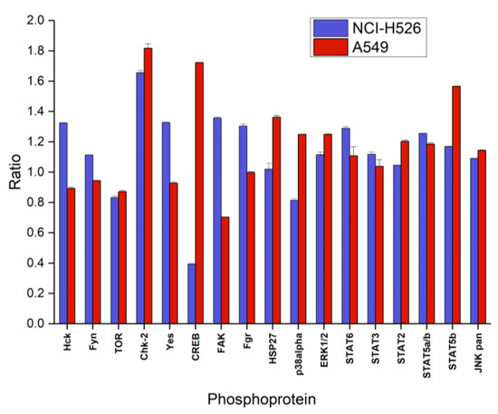 Relative phosphorylation (ratio of treatment:control) of selected components (part A of the array) of the signal transduction system (mean ± SD) of NCI-H526 and A549 cells treated with 0.5 µM fascaplysin for 72 h (NCI-H526: significantly different to controls, except for HSP27 and STAT2; A549 significantly different to controls, except Fgr and STAT3).