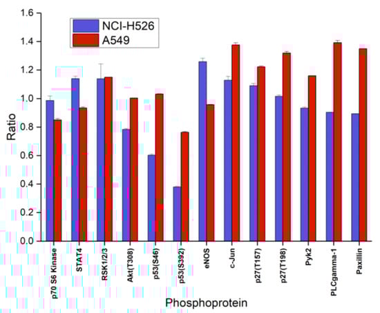 Relative phosphorylation (ratio treatment: control) of selected components (part B of the array) of the signal transduction system (mean ± SD) of NCI-H526 and A549 cells treated with 0.5 µM fascaplysin for 72 h (NCI-H526: significantly different to controls, except forp70 S6 kinase and p27; A549 significantly different to controls, except Akt, p53/S46, and eNOS).