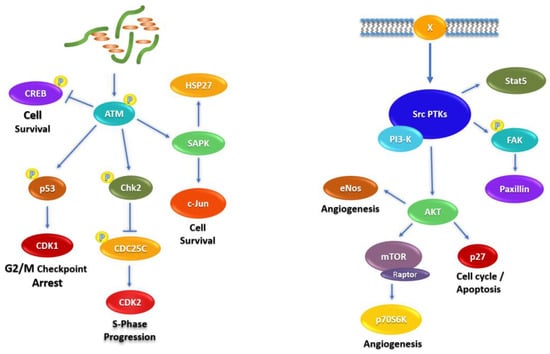 The signal transduction mediators related to fascaplysin-induced alterations in NCI-H526 and A549 cells are depicted schematically in Figure 6. The schemes start with fascaplysin-induced DNA damage (left) and receptors/src kinases (right), respectively. Chk2 is activated by upstream DNA damage-sensing ATM and modulate functions of CREB, p53, CDC25, and stress kinases (left). Src kinases are activated by a number of connected membrane receptors (X) or oncogenic mutation, and regulate the activities of Stat5, FAK, and the Akt–mTOR axis (right).