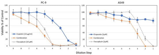 Combination indices (CI) were calculated using the Chou-Talaly method, indicating synergy at values <1 [23]. For NCI-H526, CIs < 0.49 were found for cisplatin concentrations 0.625–5 µg/mL and 0.125–1 µM fascaplysin (fixed ratio of 2.5:1), similar to A549 with CI < 0.62 for cisplatin concentrations 1.25–10 µg/mL and 0.25–2 µM fascaplysin (fixed ratio of 5:1). For the NSCLC lines PC-9 and A549, the synergistic effects of fascaplysin with cisplatin or etoposide are shown in Figure 7.