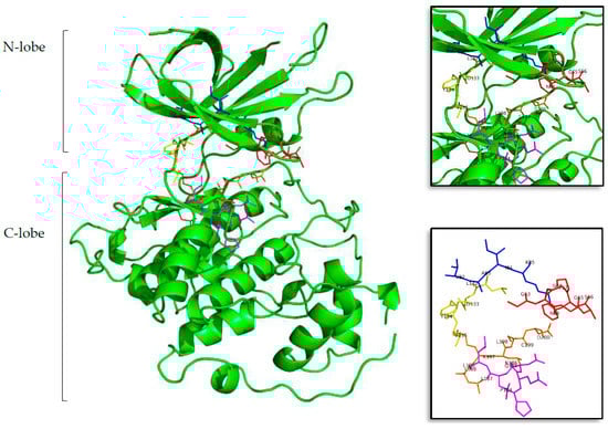 It is generally accepted that the ATP binding site of protein kinases, despite the fact that their catalytic domains are highly conserved, still remain the most used cavity in (rational) drug design over this family of proteins []. Protein kinases have two different lobes, the N-lobe that is mainly formed by β-sheets and the C-lobe formed by a helical structure. Between both lobes can be found the catalytic ATP cavity, which can be divided into five regions: glycine-rich region (GRR), hydrophobic pocket (HP), adenine region (AR), sugar pocket (SP), and the phosphate binding pocket (PBP) [,,]. GRR and HP are located at the N-terminal lobe, while SP and PBP are placed at the C-terminal lobe. AR is in the middle of these regions, providing a link between them (see Figure 1).