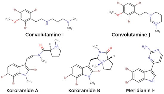 Chemical structures of convolutamine I, convolutamine J, kororamide A, kororamide B, and meridianin F.