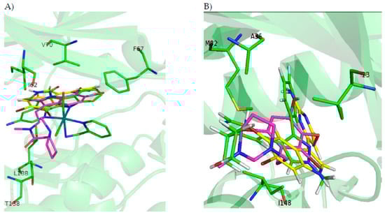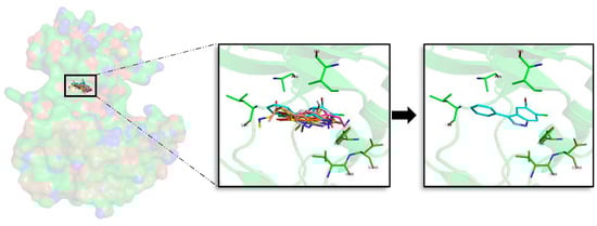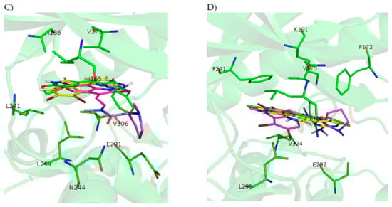 All those compounds with energies higher than −9.0 kcal/mol obtained in at least one of the studied targets were considered promising compounds. In fact, after analysing their scaffold, a trend can be seen because all of them have three or more aromatic rings and most of them have two indole scaffolds (Figure A1). Some interesting kinase inhibitors described in recent years corroborate this finding, since they incorporate an indole moiety on their structures [,,,,,].