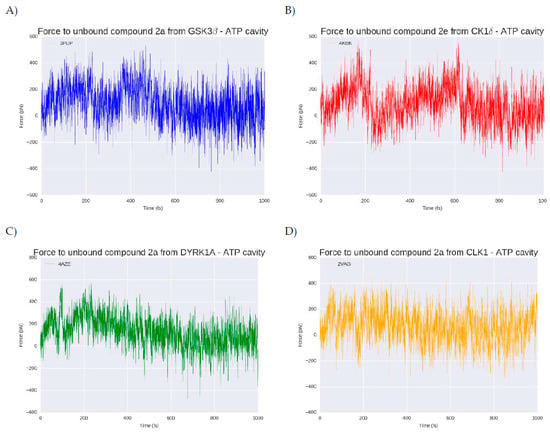Exerted force in piconewtons (pN) needed to (A) remove compound 2a (blue) from the GSK3β ATP catalytic cavity, (B) remove compound 2e (red) from the CK1δ ATP catalytic cavity, (C) remove compound 2a (green) from the DYRK1A ATP catalytic cavity and remove compound 2a (orange) from CLK1 ATP catalytic cavity. The x axis represents the computational residence time in femtoseconds (fs).