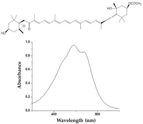 Molecular structure and ultraviolet (UV) absorption spectra of fucoxanthin from brown algae.