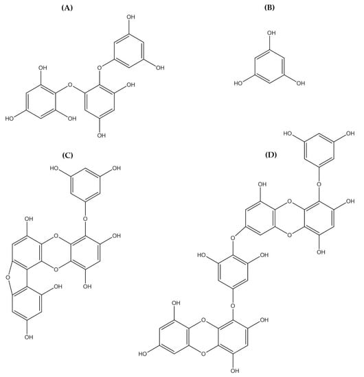 Chemical structure photoprotective polyphenol isolated from marine brown algae. Triphlorethol-A (A), phloroglucinol (B), fucofuroeckol-A (C), and dieckol (D).