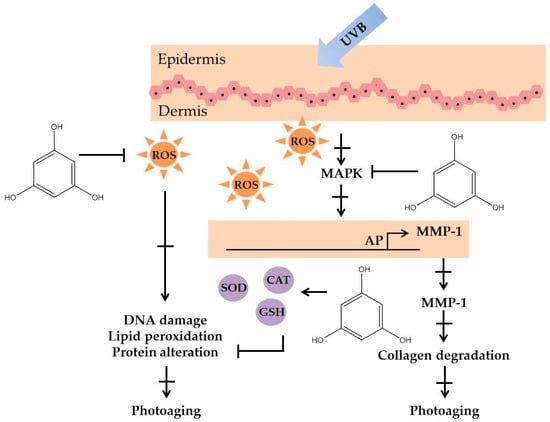 - Piao, M.J.; Zhang, R.; Lee, N.H.; Hyun, J.W. Phloroglucinol attenuates ultraviolet B radiation-induced matrix metalloproteinase-1 production in human keratinocytes via inhibitory actions against mitogen-activated protein kinases and activator protein-1. Photochem. Photobiol. 2012, 88, 381–388. [Google Scholar] [CrossRef] [PubMed]