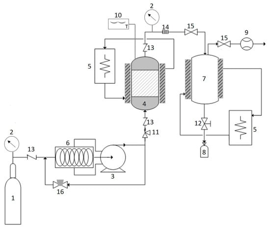 Schematic diagram of SC–CO2. The CO2 tank (1); pressure gauge (2); high pressure pump (3); extractor (4); heat exchanger (5); chiller (6); separator (7); sample collector (8); flow meter (9); digital thermometer (10); safety valve (11); needle valve (12); check valve (13); filter (14); metering valve (15); back pressure regulator (16).