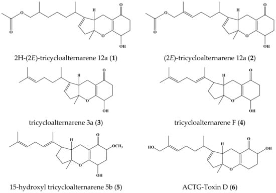 - Liebermann, B.; Ellinger, R.; Gunther, W.; Ihn, W.; Gallander, H. Tricycloalternarenes produced by Alternaria alternata related to ACTG-toxins. Phytochemistry 1997, 46, 297–303. [Google Scholar] [CrossRef]