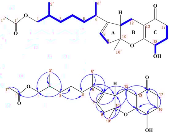 Compound 1 was isolated as a colorless oily solid and its molecular formula was deduced to be C23H34O5 according to the HR-ESI-MS spectrum, possessing seven degrees of unsaturation. The 1H-NMR spectrum of 1 showed the presence of two methyl singlets at δH-10′ 1.4 and δH-1″ 2.0 ppm, two methyl doublets at δH-2′ 0.81 and δH-6′ 0.90 ppm, one olefinic hydrogen at δH-8 5.31 ppm, one hydroxyl hydrogen at δ15-OH 5.38 ppm, one oxy methine hydrogen at δH-15 4.01 ppm, and a pair of coupled oxy methylene hydrogens at δH-1ab 3.83 and 3.75 ppm (Figure S1). The 13C-NMR spectrum of 1 exhibited 23 resonances, classified into two carbonyl carbons, four olefinic carbons, four methyl carbons, eight methylene carbons, four methine carbons, and one quaternary carbon (Figure S2). There must be three rings in the structure of 1, deduced by its NMR data and degrees of unsaturation. The 1H- and 13C-NMR spectra of 1 displayed the characteristics of the tricycloalternarene compound and were very similar to those of (2E)-tricycloalternarene 12a (2) (molecular formula C23H32O5, two hydrogens less than 1) [5]. This indicated that compound 1 might be a hydrogenated derivative of (2E)-tricycloalternarene 12a (2). A detailed NMR comparison revealed that the 1H- and 13C-NMR data of 1 from H-5 to H-17 and from C-5 to C-18 were very similar to those of (2E)-tricycloalternarene 12a (2). However, there were some obvious NMR differences between 1 and 2. Compared with (2E)-tricycloalternarene 12a (2) [5], the absence of an olefinic hydrogen at δH-3 5.38 ppm and a methyl doublet at δH-2′ 0.81 ppm instead of a methyl singlet at δH-1″ 2.0 ppm were observed in the 1H-NMR spectrum of 1. In addition, two olefinic carbons at δ 130.2 and 129.7 ppm were missing in the 13C NMR spectrum of 1, supporting the notion that the double bond between C-2 and C-3 in 2 was hydrogenated to transform into 1. Carbon signals at δC-15 64.6 and δC-17 32.2 ppm in 1 differed from those in tricycloalternarene D and tricycloalternarene E [11]. Furthermore, the 1H-1H COSY correlation between δH-15 4.01 and δ15-OH 5.38 ppm (Figure S5) and the HMBC correlation from δH-15 4.01 to δC-14 170.8 ppm (Figure S4) also proved that the secondary hydroxyl group at δ 5.38 ppm in ring C was placed at C-15. The key 1H-1H COSY and HMBC correlations, shown in Figure 2, confirmed the planar structure of 1.