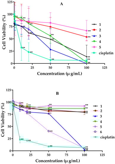 The in vitro cytotoxicity of tricycloalternarene compounds was evaluated using the MTT method. Tumor cells were seeded in 96-well plates at a density of 1 × 104 cells/well in 100 μL RPMI 1640 medium, and the subsequent incubation was permitted at 37 °C with 5% CO2 for 24 h before assessment. Compounds at preset concentrations were added to five replicate wells and treated cells for 48 h, respectively, with cisplatin as a positive reference. MTT (10 μL) was added to each well and the plates were continued to culture for 4 h. Then, the supernatant of each well was removed and 150 μL DMSO was added to dissolve the formazan. The absorbance at 490 nm of each well was measured using an automatic ELISA plate reader (ELX800UV, BioTek Instruments, Inc., Winooski, VT, USA). The experiments were repeated three times. Cell viability was expressed as percentage of cell proliferation in comparison to the negative control.