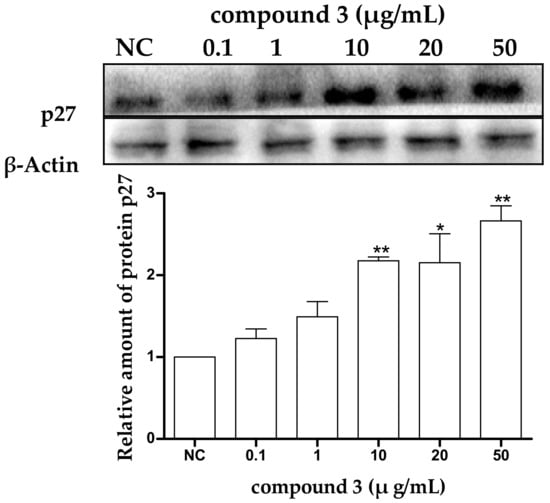 Effect of tricycloalternarene 3a (3) on the expression of protein p27 in SMMC-7721 cells. SMMC-7721 cells were treated with tricycloalternarene 3a (0.1, 1, 10, 20, and 50 μg/mL) for 48 h. Compared with negative control (NC), * p < 0.05, ** p < 0.01.