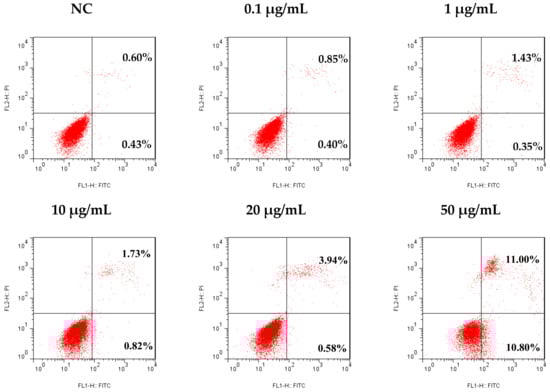 There is a balance between apoptosis and cell proliferation. As a type I programmed cell death (PCD), apoptosis plays a negative regulatory role in tumor formation and development. It had been found that the pathogenesis of many tumors is closely related to the obstruction of apoptosis [26,27]. In the present study, an Annexin V-FITC/PI dual stain assay was used to analyze the apoptosis rate of SMMC-7721 cells after 48 h of treatment with different concentrations of tricycloalternarene 3a (3), to determine whether the anti-proliferation effect of compound 3 against SMMC-7721 cells was associated with induced apoptosis. The result showed that compound 3 induced apoptosis in SMMC-7721 cells in a dose-dependent manner. Compared with the negative control (NC), the apoptosis rate of treated cells was increased from 1.03% to 1.25%, 1.78%, 2.55%, 4.52%, and 21.8%, respectively (including early apoptosis and late apoptosis, Figure 6), indicating that tricycloalternarene 3a could enhance apoptosis in SMMC-7721 cells and inhibit SMMC-7721 cell proliferation via this induced apoptosis.