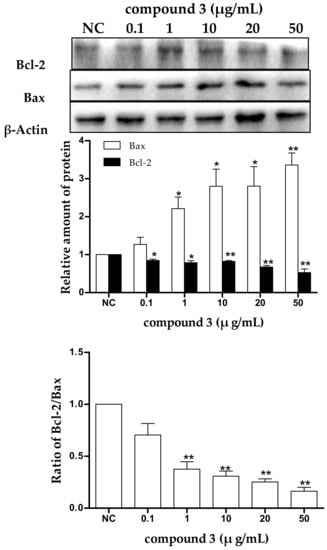 The effect of tricycloalternarene 3a (3) on the expression of protein Bcl-2 and Bax in SMMC-7721 cells. SMMC-7721 cells were treated with tricycloalternarene 3a (0.1, 1, 10, 20, and 50 μg/mL) for 48 h. Compared with negative control (NC), * p < 0.05, ** p < 0.01.