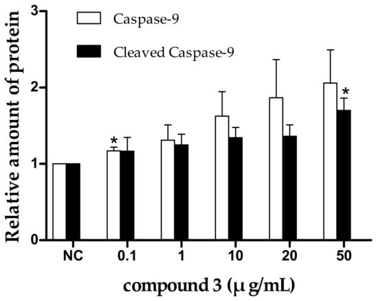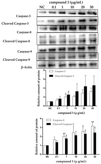 Apoptosis is often an energy-dependent process, which involves the activation of a group of cysteine proteases (i.e., caspases) and a complex cascade of events that link the initiating stimuli to the final demise of the cell [33]. Caspases are family effector proteins that play an important role in apoptosis. They usually activate or deactivate the substrate proteins by protein hydrolysis to regulate apoptosis. To date, 10 major caspases have been identified and broadly categorized into initiators (caspase-2, -8, -9, and -10), effectors or executioners (caspase-3, -6, and -7), and inflammatory caspases (caspase-1, -4, and -5) [33]. Among these, caspase-3 is one of the most important executors of cell apoptosis, and the activation of caspase-3 in apoptosis seems to be an irreversible step towards cell death [34]. To clarify the roles of caspases in tricycloalternarene 3a-induced apoptosis, the expression levels of caspase-3, -8, and -9 and cleaved caspase-3, -8, and -9 were detected by Western blot. As shown in Figure 8, the expression levels of caspase-3, -8, and -9 and cleaved caspase-3, -8, and -9 were all improved in a dose-dependent manner, which verified that tricycloalternarene 3a-induced apoptosis in SMMC-7721 cells was dependent on caspases activation.