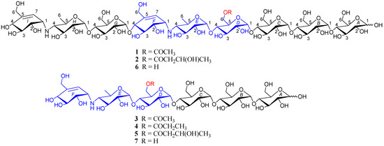 The following are available online at https://zenodo.org/record/1471953#.W9LTdvabyUm. HRESIMS, HRESIMS/MS, 1H, 13C NMR, DEPT, 1H-1H COSY, 1D-selective TOCSY, 2D TOCSY, HSQC, HSQC-TOCSY, HMBC, ROESY, IR, and UV spectra and [α]D data of the new acylated aminooligosaccharides 15; 1H NMR and HPLC-ELSD of the alkaline hydrolysis products of 1 and 2 and 35.
