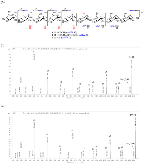 α-Amylase, belonging to glycoside hydrolase family 13 (GH 13), is widely found in organisms, including plants, animals, bacteria, and fungi [1]. It is an endoamylas, which catalyzes the hydrolysis of α-(1 → 4)-d-glucosidic bind of starch, amylase, amylopectin, glycogen, and various maltodextrins into smaller oligomers [2]. The inhibitors of α-amylase are of pharmacological importance, as α-amylase is considered as an attractive target for treating elevated post-prandial blood glucose levels resulting in type II insulin-independent diabetes, obesity, and other related secondary symptoms [3]. The well-known acarbose, originated from Actinoplanes species, is recognized as one of the most clinically important α-amylase inhibitor [4]. It is a member of the aminooligosaccharides family exclusively produced by microorganisms, particularly soil bacteria of the order of Actinomycetes. Structurally, aminooligosaccharides contain a single or repeated pseudo-trisaccharide core(s) with D-glucose units attached to the reducing and non-reducing end through α-(1 → 4) glycosidic bond [4,5]. Pseudo-trisaccharide core is formed by an acarviosine moiety and a D-glucopyranose group through an α-(1 → 4) quinovosidic bond; acarviosine is composed of an unsaturated C7N aminohexitol (valienamine) unit and a 4,6-dideoxy-d-glucopyranose (4-deoxy-d-quinovopyranose) unit; and the amino-hexitol bond is defined as pseudo-glycosidic bond. Therefore, aminooligosaccharides are termed as acarviostatins followed by a Roman numeral and two numbers, i.e., acarviostatin I01 (acarbose). Acarvios originates from the acarviosine core; the Roman numeral represents the number of the pseudo-trisaccharide cores; the middle digit indicates the number of glucose residues at the no-reducing end and the last digit infers the number of glucose residues at the reducing end. Generally, an extensive MS study is helpful to discriminate the structure of aminooligosaccharides, due to their characteristic positive-ion ESIMS/MS fragmentation pattern [6,7,8,9,10,11,12,13,14,15,16]. The formation of bi and yj fragment ions is typical of glycosidic bond dissociation of protonated oligosaccharides. Every glycosidic bond could be dissociated, including the pseudo-glycosidic bond within the acarviosin moiety. Moreover, the cleavage of the quinovosidic bond in the pseudo-trisaccharide core happened more readily than that of an ordinary glycosidic bond in the molecule. Until now, guided by the MS study, hundreds of aminooligosaccharides have been quickly identified, including trestatins [6,7], isovalertatins [8,9], butytatins [10], acarviostatins [11,12,13,14,15], SF638-1 [16], as well as artificial acarbose analogues (i.e., G6-Aca, G12-Aca) [2]. Many have shown more potent porcine pancreatic α-amylase (PPA) activities than acarbose, among which acarviostatins III03 [11] was the most effective PPA inhibitor known to data. It was reported that the acarviosine unit was postulated to be essential for its biological activity [17]. In addition, the number of the pseudo-trisaccharide cores along with the D-glucose residues also affected the PPA inhibitory activity [18].