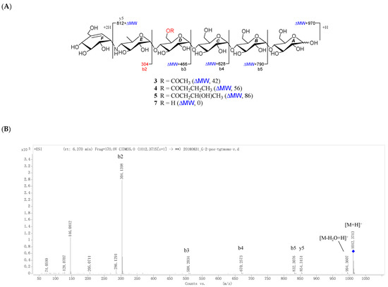 D6-O-acetyl-acarviostatin I03 (3) was obtained as an optical active white amorphous powder. Its molecular formula, C39H65NO29, was suggested by a sodiated molecular ion peak at m/z 1012.3713 [M + H]+ (calcd for C39H66NO29 1012.3715). The 13C NMR (Table 2) spectrum revealed 39 carbon resonances, which were classified by DEPT and HSQC experiments as a ester carbonyl (δ 177.0), a tri-substituted double bond (δ 142.3 and 126.1), two methyls, five sp3 methylenes, and twenty-nine sp3 methines. The olefin and carbonyl groups accounted for two of the eight degrees of unsaturation, therefore, 3 should be in hexacyclic ring system (residues AF). Its 1H and 13C NMR data (Table 2) closely resembled those of 1, suggesting that 3 possessed a single pseudo-trisaccharide core with three D-glucose units on the reducing end and also an acetyl ester at C-D6, in analogy to 1. In fact, 3 differs from 1 only by the absence of the repeated pseudo-trisaccharide core in the non-reducing end in 1, in agreement with 465 mass units less than that of 1, which was supported by the disappearance of the characteristic NMR signals of residues FH in 1 resonating at δH 3.53 (H-F1)/δC 57.8 (C-F1), δH 4.24 (H-F4)/δC 79.1 (C-F4), δH 4.22, 4.14 (H2-F6)/δC 64.9 (C-F6), δH 5.98 (H-F7)/δC 129.2 (C-F7), and δC 139.4 (C-F5); δH 5.38 (H-G1)/δC 100.4 (C-G1) and δH 3.86 (H2-G6)/δC 63.5 (C-G6); and δH 5.33 (H-H1)/δC 103.4 (C-H1), δH 2.48 (H-H4)/δC 67.8 (C-H4), and δH 1.35 (Me-H6)/δC 20.2 (C-H6), respectively. Moreover, the 1H and 13C NMR spectra of 3 were almost superimposable on those of the model known acarviostatin I03 (7) [11], with the exception of an additional acetyl group [δC 177.0 (qC); δH 2.16 (3H, s)/δC 23.1 (CH3)] in 3. The distinct HMBC correlation from H2-D6 [δH 4.43 (1H, dd, J = 12.5, 2.0 Hz) and 4.24 (1H, brd, J = 12.5 Hz)] to the acetyl carbonyl and the characteristic HRESIMS/MS fragment ions (Figure 3A,B and Figure S60) at m/z 854 (y5), 832 (b5), 670 (b4), 508 (b3), and 304 (b2) allowed to locate the acetyl group at OH-D6, thus completely defining the structure of 3. Finally, the small 1H-1H coupling constants of the anomeric protons and its ROESY spectrum indicated the glycosidic bonds to be α-(1 → 4), identical to those in 7, which was supported by chemical conversion of 3 to 7. Therefore, compound 3 is an acetyl derivative of 7, namely as D6-O-acetyl-acarviostatin I03.