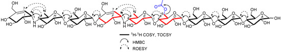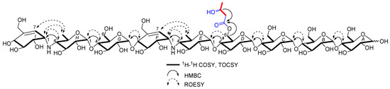 The HRESIMS of D6-O-β-hydroxybutyryl-acarviostatin II03 (2) established the molecular formula, C60H100N2O42 [m/z 1521.5829 [M + H]+ (calcd. for C60H101N2O42, 1521.5823)], indicating 44 mass units more than that of 1. Comparison of the overall 1H and 13C NMR data of 2 with those of 1 revealed that the difference can be recognized in the absence in 2 of the acetyl group replaced by a β-hydroxybutyryl group [δC 176.6; δH 2.67 (dd, J = 15.0, 4.5 Hz), 2.59 (dd, J = 15.0, 8.0 Hz)/δC 45.9; δH 4.27 (m)/δC 67.3; and δH 1.26 (d, 6.4 Hz)/δC 24.8 in 2]. The presence of the β-hydroxybutyryl group was supported by the newly appeared CH3CH(OH)CH2− spin-spin coupling system in the TOCSY spectrum (Figure 5) and by the HMBC correlation (Figure 5) between the oxy-methine (δH 4.27) and the ester carbonyl (δC 176.6, qC). Accordingly, the 13C NMR data in the inner pseudo-trisaccharide core (residues DF) in 2 remained unaffected, although different acyl groups, β-hydroxybutyryl group in 2 vs. acetyl group in 1, were esterified at C-D6. Moreover, the similar 13C NMR data changes in 2 around the residue D (C-D4, +1.0 ppm; C-D5, −2.2 ppm; C-D6, +3.0 ppm in 2) and its adjacent residue E (C-E1, +0.7 ppm in 2), with respect to their common precursor 6, the distinct HMBC correlation between H2-D6 [δH 4.50 (dd, J = 12.5, 2.0 Hz) and 4.26 (m)] and the ester carbonyl, and a series of positive-ion HRESIMS/MS peaks (Figure 2A,C and Figure S41) at m/z 1363 (y8), 1218 (y7), 1056 (y6), 898 (y5), 769 (b5), 466 (b3), and 304 (b2) further supported the assignment. Analogously to 1 and 6, the configuration of the glycosidic bonds was determined to be α-(1 → 4) by analysis of the 1H-1H coupling constants of the anomeric protons and by interpretation of its NOESY experiment (Figure 5), which was confirmed by the alkaline hydrolysis of 2 to 6. Thus, the structure of D6-O-β-hydroxybutyryl-acarviostatin II03 (2) was determined as depicted.