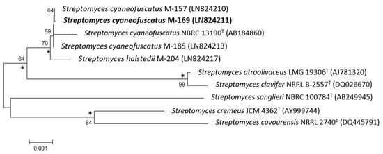 Neighbour-joining phylogenetic tree obtained by distance matrix analysis of 16S rDNA sequences, showing Streptomyces cyaneofuscatus M-169 position and most closely related phylogenetic neighbours. Numbers on branch nodes are bootstrap values (1000 resamplings; only values >50% are given). Asterisks indicate that the corresponding nodes were also recovered in the maximum likelihood tree. Bar indicates 0.1% sequence divergence.