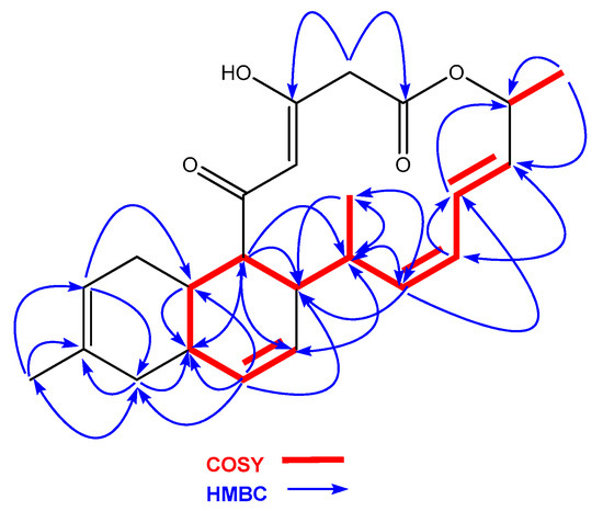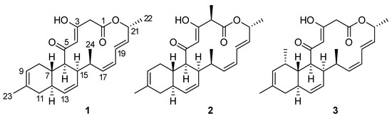 Anthracimycin B (1) was isolated as a white amorphous solid, whose molecular formula, C24H30O4, was deduced from the presence of a protonated ion at m/z 383.2220 in its ESI-TOF mass spectrum (calc. for C24H31O4+, 383.2217). This molecular formula together with UV absorption maxima at 236 and 288 nm were compatible with an anthramycin-like structure for the molecule. Chemical shifts measured in its 1H and 13C NMR spectra (Table 1) corroborated this structural similarity. Comparing the 1D and 2D NMR spectra with those published for anthracimycin [2], the major differences were found in the region around carbons, C-1 to C-3, where the methyl group attached to C-2 in 2 was absent in the structure of 1. Analysis of the 1H NMR and HSQC spectra revealed the presence of two doublet methylene protons (δH = 3.50 y 3.22 ppm), which correlated in the HMBC spectrum to the signals of the lactone carbonyl C-1 and the oxygenated enol carbon C-3. Additionally, signals corresponding to H-23 and C-23 of anthracimycin were not observed in the spectra of 1. Similar NMR chemical shifts reported for 3 [9], having the same substructure as 1 around the C-1 to C-3 region, confirmed our structural proposal. These evidences, together with correlations observed in the COSY and HMBC spectra of 1 (Figure 4), confirmed the planar structure of anthracimycin B as depicted in Figure 3. The similarity in magnitude and negative value of the specific rotations of 1 and 2 ( −338.9 (1), −333.0 (2) [2]), revealed that the same absolute configuration could be proposed for these two molecules. The absolute configuration of anthracimycin had previously been determined by X-ray diffraction [3]. It is also worth mentioning that during the structural elucidation of anthracimycin B, a mistake was detected in the NMR data of anthracimycin published by Jang et al. [3], where protons attached to C-15 and C-16 seemed to be exchanged based on COSY correlations analysis. The proton correlating to the signal of the methyl group H-24 in the COSY spectrum has necessarily to be H-16, so the signal at 2.60 ppm belongs to H-16, and, therefore, the signal at 1.93 ppm to proton H-15.