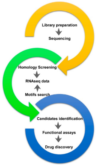 Pipeline for in silico bio-prospecting and candidate toxins identification. This includes library preparation, RNA deep sequencing, data analyses by motif and/or homology screening, and recovery of matching sequences, expression and subsequent functional testing.