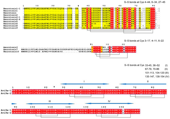 Multiple sequence alignment of the NaVs toxins in A. viridis. Based on S-S bonds arrangement, Nav toxins are reported as Type I on the top, Type II on the middle and Type III on the bottom. Alignment was performed with T-coffee tool [43]. Similar residues are written in bold characters and boxed in yellow, whereas conserved residues are in white bold characters and boxed in red. The sequence numbering on the top refers to the alignment. For each alignment, the pattern of Cys residues forming disulfide bridges is shown. Pro-peptide processing sites are pointed out by an inverted black triangle. The four motifs of the active toxins for Avi 9a-1 and Avi 9a-2 are indicated by the blue arrows.