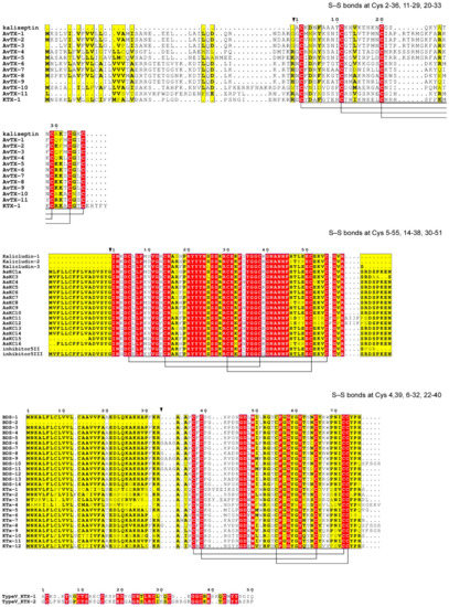 Based on polypeptide length and exhibition of a specific pattern of S-S bonds (2–36, 11–29, 20–33; I–VI, II–IV, III–V), biochemical isolation and motif scan on RNA datasets retrieved the existence of a Type 1 K+ toxin subset including 12 peptide toxins with substantial homology to kaliseptine (AvTx1–11 [17] and KTX-1 [19] (Figure 3). It may be easily predicted by the SignalP algorithm [51] that after the proteolytic releases mature toxins, AvTx1–11 and KTX-1 consist of about 40 amino-acid residues. None of these molecules were tested for pharmacology properties, so whether these toxins possess KV-blocking or proteinase-inhibiting activity is an open issue for future investigations. Type 1 A. viridis KV blockers belong to structural group 2a, because they conform with the following Cys-pattern: C8C–X1–C*C3C2C, where X1 = 8 or 4, and *—is for highly variable intervals (according to Reference [33]).