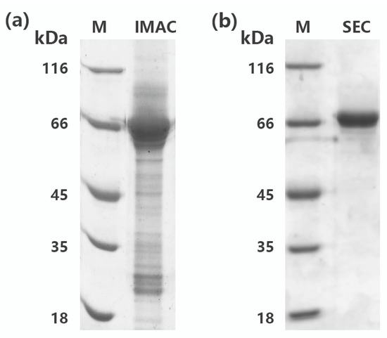 SDS-PAGE analysis of rMaBGA first purified by immobilized metal affinity chromatography (IMAC) (a) and then purified by size exclusion chromatography (SEC) (b). Lane M: protein molecular weight marker. Lane IMAC: rMaBGA purified by IMAC. Lane SEC: rMaBGA purified by IMAC and SEC, sequentially.