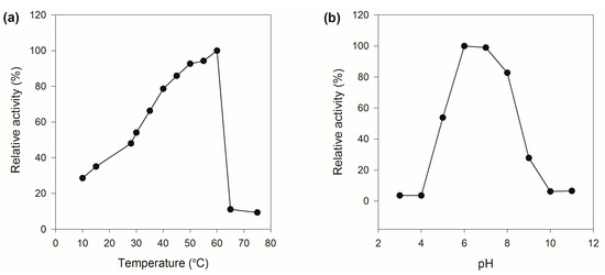 Effects of temperature and pH on the activity of rMaBGA. (a) Effect of temperature on the activity of rMaBGA; (b) effect of pH on the activity of rMaBGA.