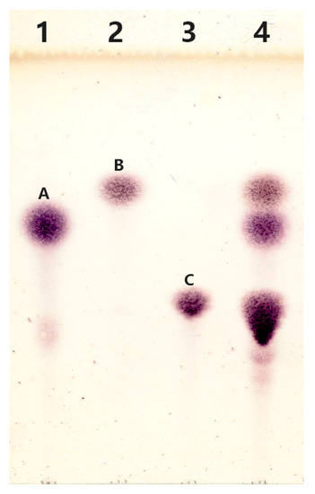 The reaction mixture was subjected to thin-layer chromatography analysis after removal of the enzyme. It is obvious that the reaction mixture (Figure 4) contained spots corresponding to spots A (galactose), B (glucose), and C (lactose), indicating the occurrence of the hydrolysis reaction. In addition, several blurry spots can be found from Lane 4 at the position below spot C. It is supposed that the substance represented as blurry spots might be the products of transglycosylation reaction catalyzed by rMaBGA.