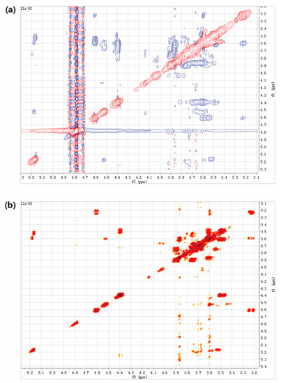 In the present study, two-dimensional NMR techniques, 1H-1H COSY and NOESY were adopted to resolve structure of the trisaccharides presented in LLZ-02 (Figure 5), using trisaccharide O-β-D-galactopyranosyl-(1-4)-O-β-D-galactopyranosyl-(1-4)-D-glucopyranose (4′-galactosyl-lactose) as reference in the analysis. All the chemical shifts were tabulated in Table 3 according to the signal of 1H-1H COSY. Clear NOE was detected between H1 of β-galactosyl-A (4.37 ppm) and H4 of α-glucosyl (3.50 ppm)/β-glucosyl (3.46 ppm), as well as between H1 of β-galactosyl-B (4.50 ppm) and H3 of β-glucosyl (3.42 ppm). It is suggested that the linking between β-galactosyl-A and α-glucosyl/β-glucosyl occurred at the 1,4 sites, and the linking between β-galactosyl-B and β-glucosyl occurred at the 1,3 sites. Therefore, the trisaccharide of LLZ-02 was determined as β-D-galactosyl-(1-3)-β-D-galactosyl-(1-4)-D-glucose (3′-galactosyl-lactose, Figure 6).