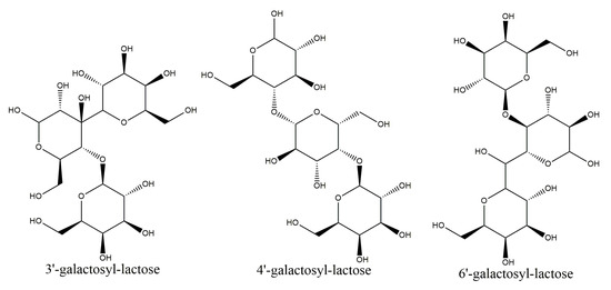 Molecular structures of 3′-galactosyl-lactose, 4′-galactosyl-lactose, and 6′-galactosyl-lactose.