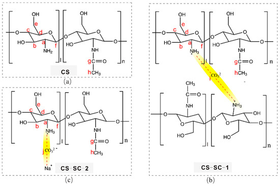 The chemical structural schemes of (a) chitosan (CS), (b) chitosan-sodium carbonate (CS-SC)-1, and (c) CS-SC-2. Carbon atoms are assigned using the alphabetical labels. The connections between carbonate, ammonium, and sodium ions are highlighted in yellow.