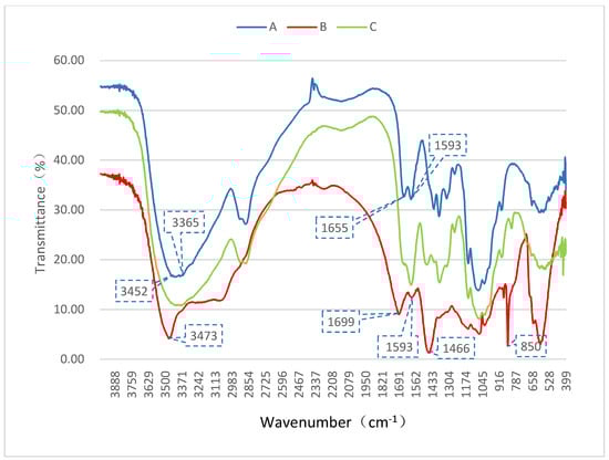 Fourier transform infrared (FT-IR) spectrometry was used to monitor the structural changes in chitosan (A), the complex of chitosan-sodium carbonate (B), and restored chitosan (C). The obtained infrared spectra are shown in Figure 2. As the amino and hydroxyl groups formed intermolecular and intramolecular hydrogen bonds, the OH stretching vibration and NH stretching vibration, which were originally located around 3400 cm−1, fused into a broad intense band at 3452–3365 cm−1 in the FT-IR spectrum of chitosan (A), whose characteristic absorption spectrum includes these peaks [19]. The spectrum of the complex (B) shows a completely different absorption peak at 3473 cm−1, appearing as a sharp peak, which indicates that the hydrogen bonds between the amino and hydroxyl groups were destroyed, thus showing obvious OH or NH stretching vibrations. The two absorption peaks at 1655 cm−1 and 1593 cm−1, which are peak I and peak II and represent amide bonds, are also characteristic peaks of chitosan (A) [20]. In the complex (B), these two characteristic peaks still exist but with a slight shift (1699 cm−1 and 1593 cm−1), indicating the existence of a –NH–CO– structure in the complex. Thus, the residual acetamido in the main chain did not participate in the reaction. The IR spectrum of the complex (B) displayed additional peaks with respect to chitosan (A), which are characteristic peaks of the inserted carbonate group (–CO32−) signals: 1466 cm−1 and 850 cm−1. The strong absorption peaks at these two locations indicate carbonate signals [21].