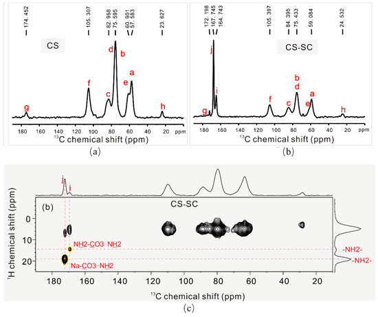 We deduced that the structures of the new compounds that formed the chitosan complex were those of CS-SC-1 and CS-SC-2 in Figure 1b,c. A carbonate is bound to either two protonated amino groups to form a complex, or one protonated amino group and one sodium ion. The connections between carbonate and the sodium ions in the sodium carbonate with the protonated amino group in chitosan were verified by SSNMR (Figure 3), which is able to locally and selectively probe the chemical environment of each carbon nucleus. The identification of each 13C peak corresponds with the alphabetical labels shown in Figure 1 and Figure 3. Chitosan (Figure 1a and Figure 3a) was identified by the 13C resonances observed at carbon chemical shifts, δ~57.583 (Ca), 75.595 (Cb, Cd), 82.958 (Cc), 60.961 (Ce), 105.307 (Cf) ppm. Two additional 13C resonances were observed at δ~174.452 (Cg) and 23.627 (Ch), which were assigned to the residual carbonyl (Cg) and methyl (Ch) typically present in the chitosan skeleton [26,27]. During the reaction of chitosan with sodium carbonate, a chitosan–sodium carbonate complex was obtained (Figure 1b,c), which was composed of CS-SC-1 and CS-SC-2. The structures of CS-SC-1 and CS-SC-2 were easily confirmed by the observation of two 13C resonances corresponding to Ci and Cj at δ~164.743 (Ci) and 167.745 (Cj), respectively (Figure 3b). These structures are a consequence of the two possible reactions’ dependence on the amount of sodium carbonate. When the amount of carbonate was insufficient, two ammonium ions bound to a carbonate; when the amount of carbonate was sufficient, one ammonium ion and one sodium ion each bound to carbonate, as shown in Figure 1b,c. It can be seen from the SSNMR 2D 13C–1H FSLG-HETCOR spectrum of CS-SC (Figure 3c) that the hydrogen on the amino group and the carbon in the carbonyl group had very strong cross-polarization signals, which proves the connection between them.