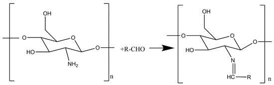 Chitosan can react with aldehydes (through the Schiff base reaction) by the condensation of amino and aldehyde groups. That is why chitosan can be crosslinked with glutaraldehyde to form a hydrogel [24,25]. The reaction formula is shown in Figure 5. We performed the Schiff base reaction with the chitosan-sodium carbonate complex and glutaraldehyde, adopting a typical preparation process. However, no gel was formed by crosslinking. We prepared restored chitosan by adjusting the solution to pH 5.0 with hydrochloric acid; then, the Schiff base reaction occurred successfully. Therefore, we suppose that the amine of chitosan combined with carbonate during the formation of the complex and dissociated during the restoration.