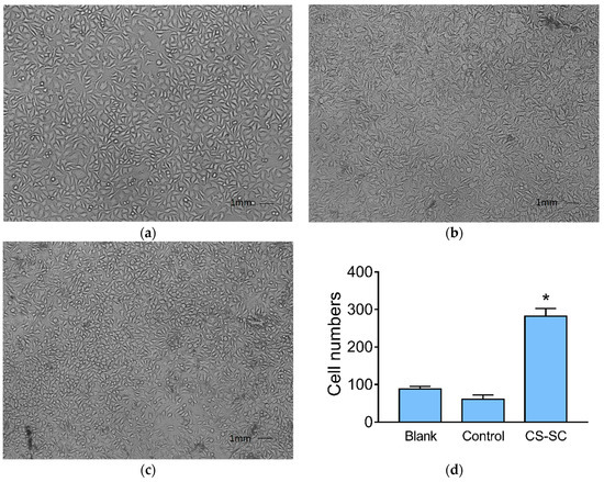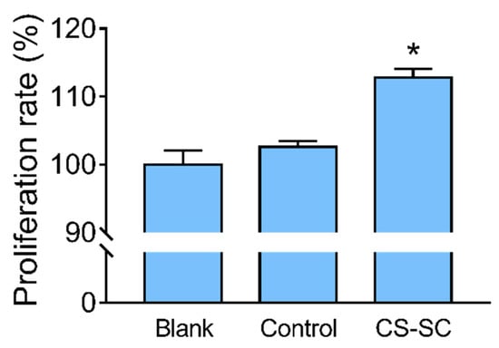 Percentage of cell proliferation after 48 h exposure. * Statistically significant differences were observed between the control film and CS-SC film wells (values are means ± s.e.m, p < 0.05, n = 3).