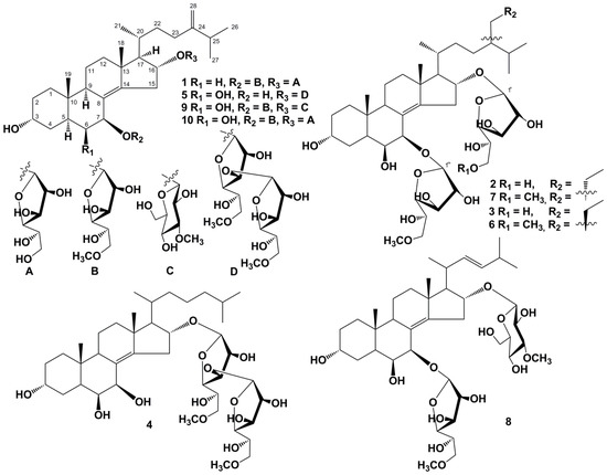 A series of glycosides of polyhydroxysteroids, named anthenosides, were previously isolated from starfishes of the genus Anthenea [13,14,15,16,17]. These compounds have a range of unusual structural features: Δ8(14)-3β,4β,6β,7β,16α-pentahydroxy, Δ8(14)-3β(α),6β,7β,16α-tetrahydroxy, or Δ8(14)-3α,7β,16α-trihydroxy steroidal nuclei; unoxidized side chains; and β-d-galactofuranosyl, 6-O-methyl-β-d-galactofuranosyl, 3-O-methyl-β-d-galactofuranosyl, 3-O-methyl-β-d-glucopyranosyl, 4-O-methyl-β-d-glucopyranosyl, or 2-acetamido-2-deoxy-4-O-methyl-β-d-glucopyranosyl residues.