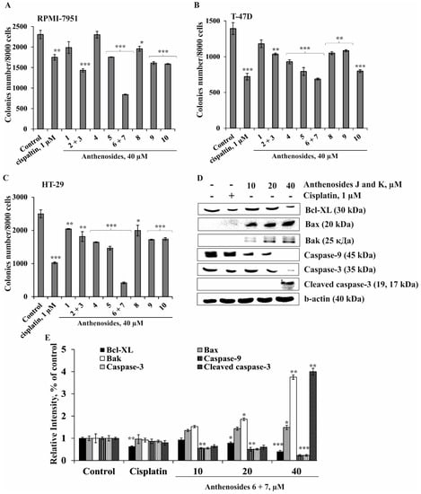 The effects of anthenosides 1–10 on colony formation of human melanoma, breast cancer, and colorectal carcinoma cells and on induction of apoptosis of HT-29 cells. RPMI-7951 (A), T-47D (B), and HT-29 (C) cells (2.4 × 104/mL) treated with/without the investigated compounds (40 µM) or cisplatin (1 µM) (positive control) were exposed to 1 mL of 0.3% Basal Medium Eagle (BME) agar containing 10% FBS and overlaid with 3.5 mL of 0.5% BME agar containing 10% FBS. The culture was maintained at 37 °C in a 5% CO2 atmosphere for 2 weeks. The colonies were counted under a microscope with the aid of the ImageJ software program. The significant differences were evaluated using Student’s t test. The asterisks indicate a significant decrease in colony formation of cancer cells treated with the tested compounds or cisplatin compared to the non-treated cells (control), * p < 0.05, ** p < 0.01, *** p < 0.001. (D) Regulation of anti- and proapoptotic protein expression, as well as initiator and effector caspase activity, by the mixture of anthenosides J (6) and K (7) in HT-29 cells. HT-29 cells were either treated by cisplatin (1 µM) or the mixture of 6 + 7 (10, 20, and 40 µM) for 24 h. After drug treatment, total protein lysates were prepared. The protein samples (30 µg) were subjected to SDS-PAGE, followed by detection with immunoblotting using antibodies against Bcl-XL (30 kDa), Bax (20 kDa), Bak (25 kDa), caspase-9 (45 kDa) and -3 (35 kDa), cleaved caspase-3 (17, 19 kDa), and b-actin (40 kDa) proteins. (E) Relative band intensity was measured using Image Lab™ Software (“Bio Rad”, Hercules, CA, USA). The quantitative results are presented as the mean value from three independent experiments. The significant differences were evaluated using Student’s t test. The asterisks indicate a significant alteration of the proteins’ expression in cells treated by cisplatin or the mixture of 6 + 7 compared with the non-treated cells (control), * p < 0.05, ** p < 0.01, *** p < 0.001.