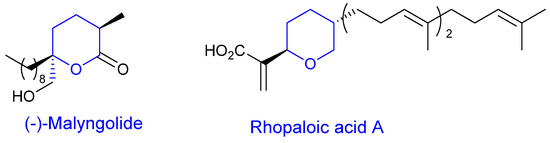 Tetrahydropyrans are interesting building blocks present in a great number of bioactive marine natural products. Some representative examples include 2,2,5-trisubstituted tetrahydropyrans such as malyngolide [1], antibiotic collected from the lipid extract of cyanobacteria Lyngbya majuscula which shows activity against M. Smegmatis and Streptococcus pyogenes, or 2,5-disubstituted tetrahydropyrans such as rhopaloic acids A and B, which have been isolated from the marine sponge Rhopaloeides sp. and show potent inhibitory activity against the embryonic development of the starfish Asterina pectinifera [2] (Figure 1). The interesting biological properties of these scaffolds together with their scarce availability has prompted scientists to develop approaches for their synthesis. Moreover, total synthesis has the advantage of enabling the introduction of structural alterations in the molecule for the preparation of analogues with potential biological properties.