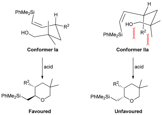 In accordance with Fleming [26,27] and Hook’s [28] models for the reaction of electrophiles with alkenes bearing an allylic stereogenic centre, two different chair-like conformations (Ia and IIa) could be drawn for vinylsilyl alcohols 1a–e. In the preferred conformation Ia the allylic hydrogen is partially eclipsing the double bond (“inside”), while the largest substituent is antiperiplanar to the alkene moiety (Figure 2). The alternative conformation IIa (with R2 inside) shows a disfavoured 1,3-allylic interaction between R2 and the silyl group and a 1,3-diaxial interaction between R2 and the Me group, which would explain the preferred formation of 2,3-trans-tetrahydropyranes 2a–e.