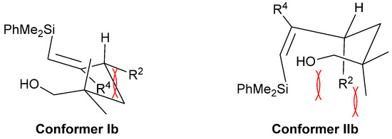 The decrease in stereoselectivity observed for arylsubstituted vinylsilyl alcohols 1i–l could be explained using the same model, since now, besides a disfavoured 1,3-diaxial interaction in conformer IIb, there is a competing 1,2-allylic interaction between R2 and R4 in conformer Ib. This interaction is especially strong when the phenyl group is coplanar with the double bond, while the possibility of rotating around would cause the loss of the resonance stabilization. For alcohols 1f–g R4 is a flexible alkyl chain and this 1,2-allylic interaction seems to be rather small (Figure 3).