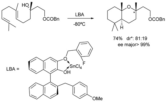 - Uyanik, M.; Ishihara, K.; Yamamoto, H. Biomimetic synthesis of acid-sensitive (−)- and (+)-caparrapi oxides, (−)- and (+)-8-epicaparrapi oxides and (+)-dysifragin induced by artificial cyclases. Bioorg. Med. Chem. 2005, 13, 5055–5065. [Google Scholar] [CrossRef] [PubMed]