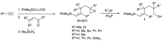 - Barbero, A.; Blanco, Y.; Pulido, F.J. Silylcuprates from Allene and Their Reaction with α,β-Unsaturatedd Nitriles and Imines. Synthesis of Silylated Oxo Compounds Leading to Cyclopentane and Cycloheptane Ring Formation. J. Org. Chem. 2005, 70, 6876–6883. [Google Scholar] [CrossRef] [PubMed]