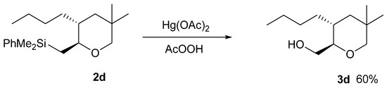 In addition, the presence of a remaining silyl group in the final tetrahydropyrans offers the attractive possibility of further functionalization. As known, Fleming-Tamao oxidation [29] permits the transformation of the silyl group to a hydroxy group. To demonstrate the potential of these tetrahydropyrans as key intermediates for the synthesis of tetrahydropyranyl marine natural products and their synthetic analogues, we have transformed tetrahydropyran 2d into the corresponding alcohol 3d [30] (Scheme 4).