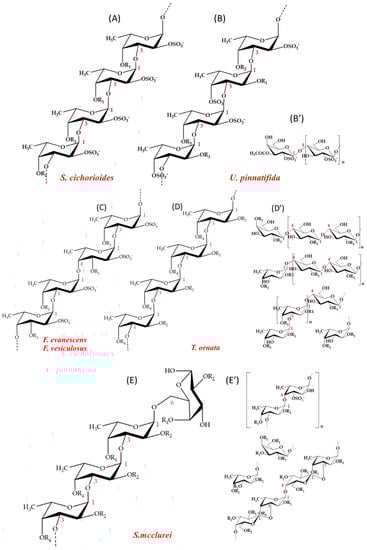Representative fucoidan structures of brown macroalgae Fucus evanescens, Fucus vesiculosus, Sargassum mcclurei, Turbinaria ornata, Saccharina cichorioides, and Undaria pinnatifida: (A) main chain of S. cichorioides composed of α(1→3)-l-fucosyls; (B) main chain of U. pinnatifida fucoidan also composed of α(1→3)-l-fucosyls; (B’) branches of U. pinnatifida fucoidan [11]; (C) main chain of F. evanescens [1] and F. vesiculosus fucoidan [8,9,10], both composed of α(1→3)- and α(1→4)-linked l-fucosyls; (D) main chain of T. ornata fucoidan composed of α(1→3)-l-fucosyls [13,14]; (D’) branches of T. ornata of α(1→3)-l-fucosyls or of β(1→4)galactosyls and mixed fucosyl-galactosyls; (E) main chain of S. mcclurei fucoidan made up of mainly α(1→3)-l-fucosyls [12]; and (E’) branches or inserts in the main chain of S. mcclurei fucoidan. In all fucoidan structures: R1: −H or −SO3−; R2: −H, −SO3− or H3COC−; R3: SO3−, H3COC− or branches; and R4: SO3− or branches.