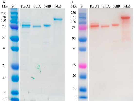 The enzymes FcnA2, FdlA and FdlB expressed well and the purified enzymes gave the expected band sizes as assessed by Sodium Dodecyl Sulfate Polyacrylamide Gel Electrophoresis (SDS-PAGE) (Figure 2A). The expression of recombinant Fda1 was high, but the protein remained in the cell debris after sonication (Figure S1). Several culture conditions for enzyme expression (temperature, medium, and isopropyl β-d-1-thiogalactopyranoside (IPTG) concentration) were tested to obtain a soluble enzyme, but without success. Fda2 expressed well, but migrated slower in the SDS-PAGE gel than expected (94 kDa). At present, the data do not allow any firm conclusions to be drawn regarding the cause of this retarded migration of the Fda2 protein, but high hydrophobicity and high levels of charged amino acids may cause anomalous SDS-PAGE migration as compared to the soluble, commercial protein standards [31]. For the enzymes FcnA2 and Fda2 more than one band was visible in both the SDS-PAGE gel and in the Western blot (Figure 2), suggesting spontaneous degradation rather than impurities from other proteins. This observation agrees with previously published data for recombinantly expressed FcnA2 reporting “co-elution” with other proteins, which could not be separated by anion exchange or SEC [24]. For the Fda2 enzyme, use of protease inhibitors such as PMSF (36978) from Thermo Fisher Scientific (Waltham, MA, USA) and a protease inhibitor cocktail (P8849) from Sigma-Aldrich (Steinheim, Germany) during purification did not improve stability, corroborating that the degradation likely occurred during expression in E. coli cells or during the subsequent purification.