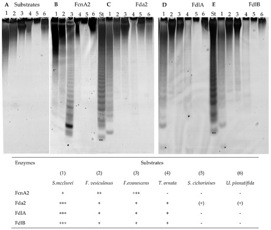C-PAGE analysis of fucoidan degradation using purified enzymes: (A) substrate control with no enzyme; and (B–E) enzymatic products from reaction of FcnA2, Fda2, FdlA, and FdlB on different fucoidans, respectively (expression of recombinant Fda1 resulted in insoluble enzymes, which is why there are no data for Fda1): (1) Sargassum mcclurei; (2) Fucus vesiculosus; (3) Fucus evanescens; (4) Turbinaria ornata; (5) Saccharina cichorioides; and (6) Undaria pinnatifida. The extent of degradation is indicated with: (+++) highest, (++) medium, (+) lowest and (+) is positive activity resulting in a high molecular smear, while (−) is no activity. The standard (St) is the product profile of FFA2 treatment of fucoidan from F. evanescens. The lowest band (**) of the St is a tetra-saccharide of (1→4)- and (1→3)-linked α-l-fucosyls sulphated at every C2 with an approximate mass of 972 Da [27]. (*) indicates an enzymatic fucoidan degradation product of either lower mass or higher charge than the lowest St band (**) compound. The reaction time was 24 h.