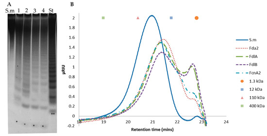 In all cases, the smallest oligosaccharide ran further than the lowest of the standard, suggesting that the released oligosaccharides are either smaller or more charged, i.e., more sulphated, than the tetra-saccharide in the standard. The SEC profiles of the FcnA2 and Fda2 were similar, but the product profile differed from those of FdlA and FdlB which contained a smaller peak at around 22.5 min (corresponding to a molecular weight SEC standard of around 1.3 kDa), indicating that they acted slower if at all on certain fucoidan fragments <1.3 kD. Taken together with the C-PAGE results (Figure 4A), these data suggest that FdlA and FdlB exerted similar substrate attack preferences and left behind some oligomers around 1.3 kDa, whereas FcnA2 and Fda2 appeared to degrade the lower molar weight oligomers to a more significant extent.